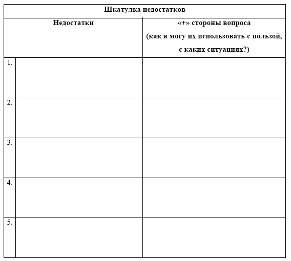 Напиши пять своих самых больших недостатков в одной стороне таблицы, а в другой – напиши, в каком месте, в какой ситуации или какому человеку эти твои недостатки могли бы, наоборот, помочь. ПИШИ!