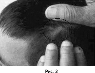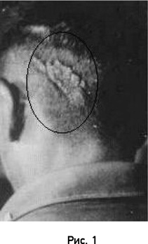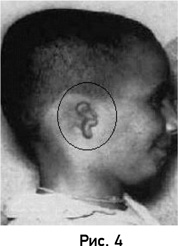 На рисунке 2 изображено маленькое круглое родимое пятно на затылке тайского мальчика, а на рисунке 3 родимое пятно большего размера и неправильной формы на передней стороне его головы. Мальчик рассказывал, что он помнит жизнь человека, который был убит выстрелом в голову сзади. (Способ смерти был проверен, но никакой медицинский документ не был доступен.) В дополнение к девяти случаям я исследовал другой случай, представленный Mills, где имели место характерные топологические признаки родимых пятен, соответствующих сквозному пулевому ранению. Этот случай был подтвержден посмертным медицинским заключением (Mills, 1989).