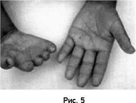 На рисунке 5 можно видеть врожденное почти полное отсутствие пальцев на руке (односторонняя брахидактилия) у ребенка из Индии. Ребенок описал свои воспоминания о жизни другого ребенка, который попал правой рукой в диск-измельчитель сельскохозяйственной фуражной машины и потерял пальцы.