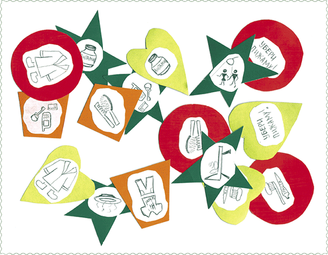 Шаг 2. Я нарисовала небольшие картиночки, иллюстрирующие каждое наше действие. Наверное, можно было найти подходящие картинки в Интернете или детских книжках, но я решила, что способна сама схематично изобразить зубную щетку, тарелку с кашей, расческу, мобильный телефон. Дальше – я сделала 4 копии этих картинок, чтобы у каждого из нас появился комплект карточек.