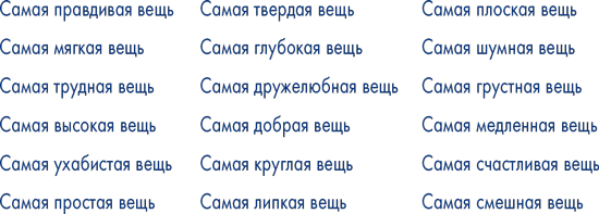 Возможно, ваше Воображение скоро поставит рекорд по количеству «вещей», которое оно может вообразить для категорий. Или, быть может, вы победите в какой-то одной строчке или в нескольких. Продолжайте! Вы можете это сделать! Вы уже у цели!