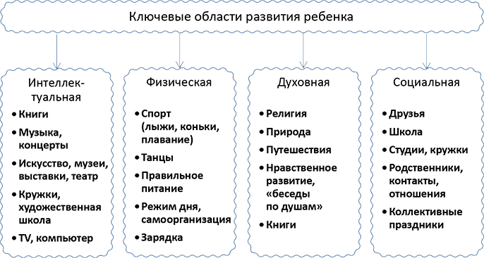 Разумеется, мы хотим, чтобы наш ребенок рос гармоничной личностью. Чтобы он был развит духовно, интеллектуально и физически. Но такое гармоничное развитие предполагает системность и целенаправленность его формирования. Итак, для начала условно делим нашу жизнь на некие «ключевые области».