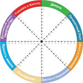 удовлетворенность ситуацией. Обозначь центр круга как 0, а окружность как 10. Заштрихуй каждый сектор в соответствии с его оценкой. Теперь ты можешь увидеть, на каком колесе едешь в данный момент к своему успеху, своей реализации. Чем оно ровнее, тем в большем балансе находятся все сферы твоей жизни.
