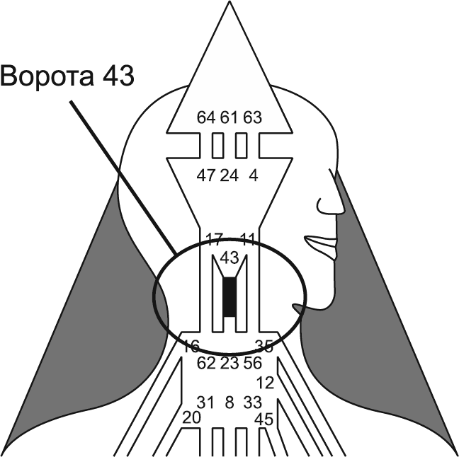 Наивысшая степень проявления энергии Ворот 43 (рис. 93) – способность находить альтернативу устаревшим методам и создавать совершенные творения. Принцип Ворот 43 гласит: цели должны соответствовать средствам. Если целью является разрушение, никакого оправдания затраченным на нее средствам быть не может. Ворота 43 – нечто вроде внутреннего слуха, помогающего отличать добро от зла.