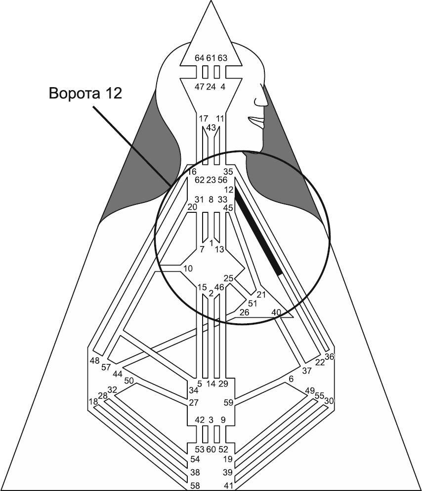 Ворота 12 (рис. 62) должны быть уверены в том, что в них нуждаются, поэтому проявляют осторожность. Энергия Корня делать человека застенчивым, если он не в настроении, или смелым, если у него все в порядке. Также Ворота 12 подключают их обладателя к мощной энергии Высших сил. Такие люди, особенно если их Горло не определено, нередко имеют экстрасенсорные способности.