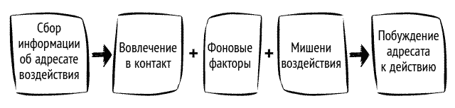 Побуждение адресата к действию нередко является результатом всех описанных действий (подходящее вовлечение адресата в контакт + воздействие на него фоновых факторов + воздействие на мишень), но может достигаться специальными средствами (например, внушением, приемами убеждения и психологическим давлением).