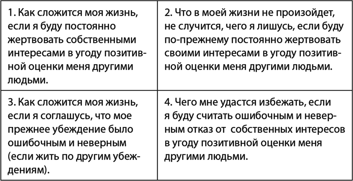 Ответ на третий вопрос дает шанс поразмышлять, чего можно достичь, если поменять свои ложные убеждения на рациональные. Если пофантазируете, как бы вы жили по другим убеждениям, перед вами предстанет ясная картина того, что вы хотели бы получить в этой новой жизни: осуществление своих целей и задач, реализация своих планов и мечтаний. Это может быть уважительное отношение окружающих, достойная заработная плата, хороший отдых, материальное благополучие, удовлетворение семьей, личной жизнью. Анализируя ответ на четвертый вопрос, вы поймете, чего могли бы избежать в новом варианте жизни с новыми убеждениями: не будет «горечи обид» плохого отношения людей, слез, алкоголиков-мужей, разводов, депрессии, ранней смерти; то есть всего того, что связано с прежними убеждениями.