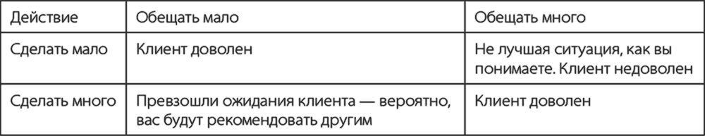 Если нарисовать простую матрицу 2 ? 2 – сколько обещали / сколько сделали, – станет понятно, что лучший вариант в долгосрочном плане – превзойти ожидания клиента. Кроме того, так вы снижаете риски. В крайнем случае, если не получится выполнить все идеально, клиент просто будет доволен – ведь вы не сделаете меньше, чем обещали.