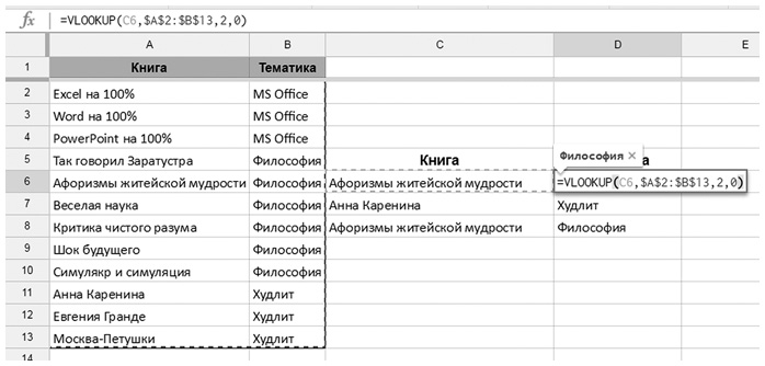 В примере мы подтягиваем тематику книги по ее названию из искомой таблицы.