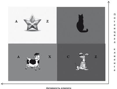 АВС-сегментация делит клиентов по объему закупок. Так, А – это самые крупные клиенты, В – средние и С – мелкие. XYZ-сегментация берет за основу частоту покупок. Х – это постоянные клиенты, Y – это нерегулярные клиенты и Z – разовые клиенты. Правило Парето «20/80» работает и в бизнесе. Соответственно, А и Х клиенты – это 20 % базы, которая дает 80 % объема продаж. Сочетание АХ – это так называемые «дойные коровы», т. е. постоянные клиенты с высокой долей покупок. Чем больше таких в базе, тем выше и выгоднее ваши продажи. СZ – это «собаки», т. е. клиенты, которые покупают мало и редко. Скорее всего, они приносят вам больше хлопот, чем прибыли, так как малые объемы не покрывают издержки на работу с ними. АZ – это клиенты-«звезды». Они купили много, но однажды. Остальные сочетания составляют группу «дикие кошки». Этих клиентов можно перевести в категорию «дойные коровы», организуя с ними правильную работу.