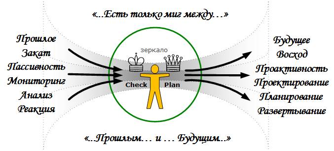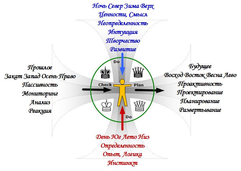 Важно увидеть, что в отличии от главной оси, где действия могут порождаться как сверху, так и снизу, эта ось имеет не два, а одно направление. От прошлого опыта и зафиксированных событий, через принятие решения к планированию, будущих действий. Или еще проще – от прошлого к будущему. Хотя, из соображений, что все в мире должно быть в динамическом балансе, эта ось не сбалансирована и требует более детального осмысления. Как вам, например, такое утверждение – Закат дня равен восходу ночи?