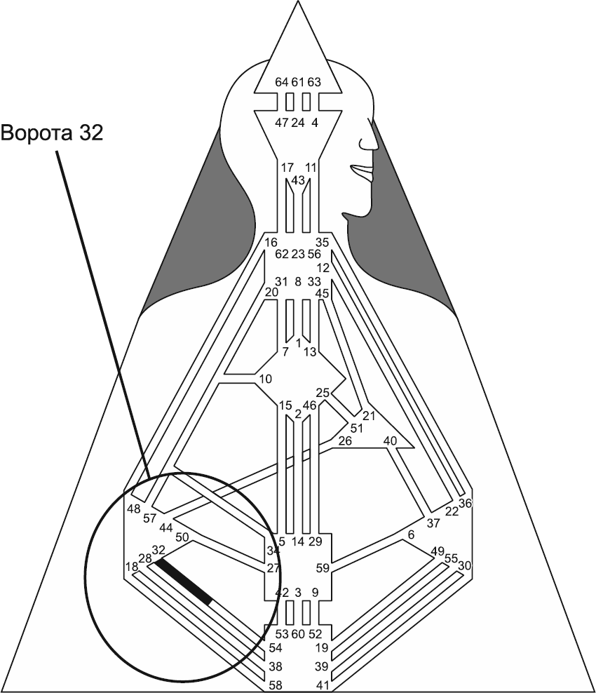 Ворота 32 (рис. 82) подсказывают момент, когда идее пора обрести форму. Они стремятся самостоятельно обеспечить процесс реализации, но не обладают достаточной для этого энергией. Зато они позволяют разложить по полочкам, что, когда и как лучше сделать, причем эта информация приходит в виде озарения. Эта энергия требует абсолютного доверия к ней.