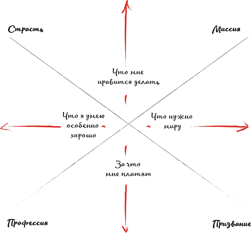 Кстати, границы кругов на схеме весьма подвижны. Рассмотрим, например, пересечение областей миссии и призвания. Согласно нашей модели, миссия это то, что человек делает с удовольствием и в чем нуждается мир. Если же вам за это заплатили или могут заплатить, миссия переходит в призвание. Для наглядности конкретный пример: