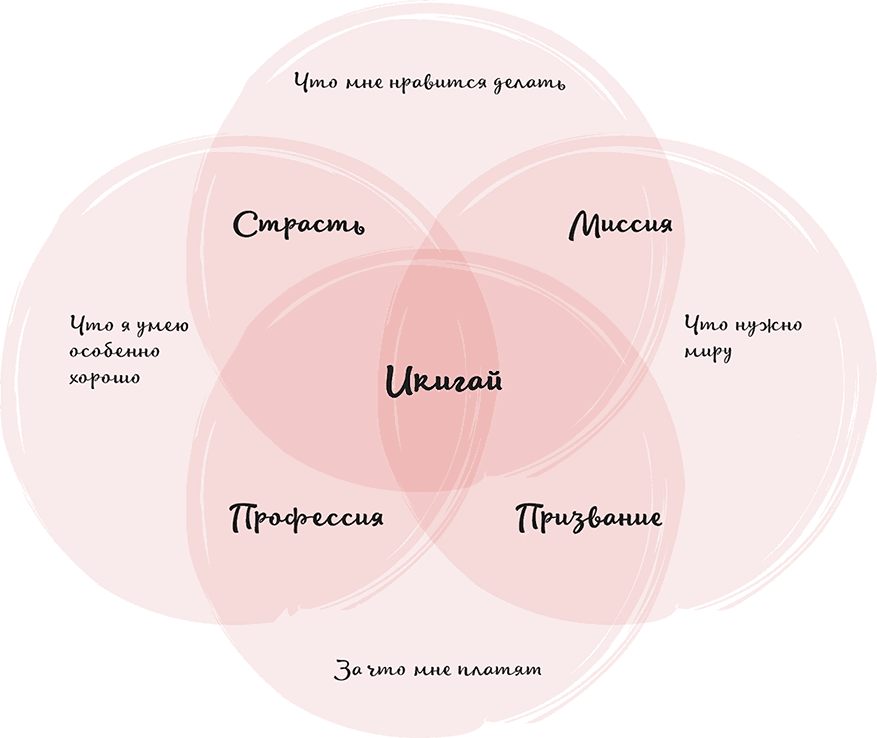 Отдельные аспекты из различных сфер могут всецело способствовать развитию Икигай. Но как только вы доберетесь до той области пересечения, что находится в центре схемы, вы сможете с большей легкостью ответить на вопросы: Зачем я встаю по утрам? Что делает мою жизнь стоящей и ценной? Что придает ей смысл?
