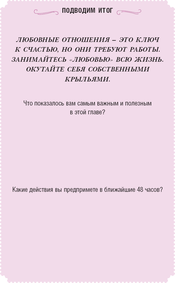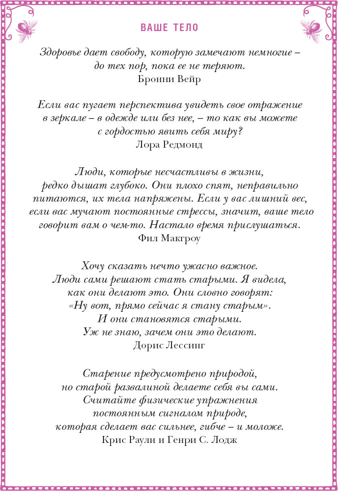 Это самые важные отношения в нашей жизни, но, как ни странно, задумываться над ними и изучать их мы начинаем только в среднем возрасте. Вы себе нравитесь? Я недавно узнала, что можно стать лучшим другом для себя самой. Счастье подобно хитроумному ограблению банка – это внутренняя работа. И первый шаг – это самосознание (не самовлюбленность!). Вы должны полюбить себя такими, каковы вы есть. Только после этого вы начнете делиться этой любовью. Никто не может получить всю необходимую любовь от других людей – поэтому вы просто обязаны любить себя.