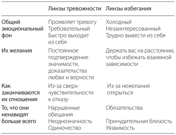 В детстве такие люди поняли: другим нельзя доверять, они не помогут, поэтому лучше действовать в одиночку. Замкнутые люди часто гордятся своей самодостаточностью и независимостью. Они высокого мнения о себе и небольшого обо всех остальных. Люди, которые смотрят через линзы избегания, предпочитают сохранять эмоциональную дистанцию даже в близких отношениях. Они неохотно раскрываются, потому что близость заставляет их чувствовать себя уязвимыми. У меня есть друг, который встречался с женщиной пятнадцать лет и ни разу не признался ей в любви. Для него это была линия, которую он не решался пересечь, а слова любви были равнозначны кошмару близости и взаимозависимости. Я не завидую женщинам, которые с ним встречались.