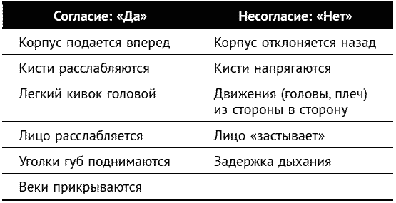 По этим реакциям мы можем узнать, согласен с нами адресат или нет, по любому вопросу. Разумеется, списки можно существенно дополнить (за счет индивидуальных особенностей) и даже существенно изменить. Единственным ограничением здесь могут стать ваши собственные способности замечать, сортировать и запоминать внешнюю информацию. Эти способности постоянно развиваются и совершенствуются по мере их применения. Со временем они станут вашими помощниками.