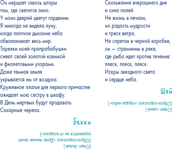 Загадайте ваш любимый цвет и затем опишите его, не упоминая его в вашем тексте. Ни единым словом, даже в заглавии. Итак, вперед, напишите, о какой вещи вы думаете в первую очередь в связи с этим цветом, какой вспоминаете вкус, запах, какую вещь этого цвета, которая висит у вас в шкафу, что в природе имеет такой оттенок, где он мерцает, что вызывает его сияние… Говорите о формах и звуках, давайте тонкие намеки и косвенные подсказки. Но не упоминайте белый, зеленый, оранжевый, коричневый или синий. Вы также можете говорить о том, что никак не связано с вашим цветом. Когда будете писать, не тревожьтесь слишком много. (Тревога просачивается в текст и разрушает его.) Будьте уверены, что ваше стихотворение будет достаточно забавным и настоящим для вас.