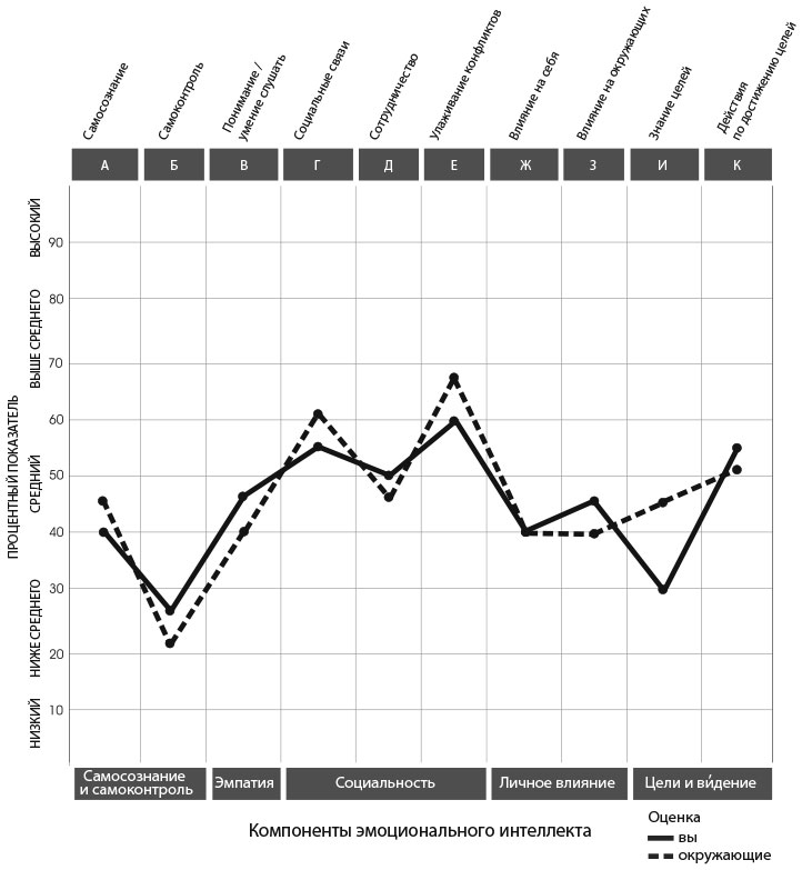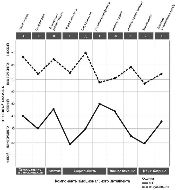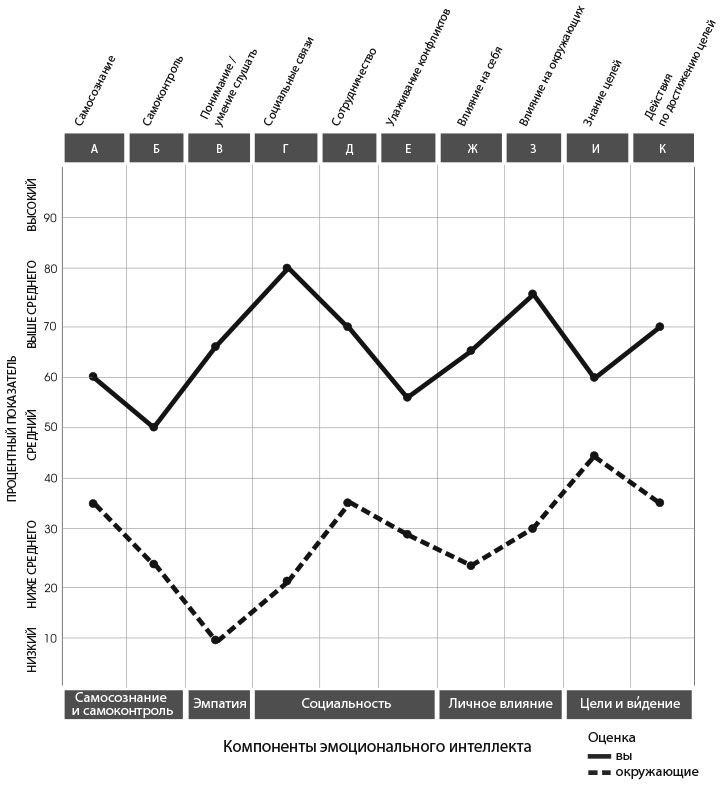 Вот примеры данных всесторонней оценки ЭИ согласно соответствующим показателям. Из приведенных таблиц видно, что оценки респондентов в каких-то случаях совпадают с оценками окружающих, а в других идут с ними совершенно вразрез. На рис. 15.1 показан график человека с адекватным взглядом на свой ЭИ. А вот графики на рис. 15.2 демонстрируют, что представления человека о самом себе далеки от мнения окружающих.