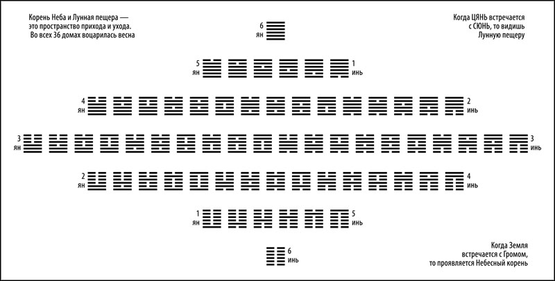 Здесь устанавливаются 6 ян и 6 инь, и таким образом янский Огонь и иньский амулет полностью представлены на схеме. 12 знаков: ВОЗВРАТ, 24, ВГЛЯДЫВАНИЕ, 19, СОГЛАСОВАННОСТЬ, 11, БОЛЬШАЯ МОЩЬ, 34, ПРОРЫВ, 43, НЕБО, СТОЛКНОВЕНИЕ, 44, УХОД, 33, НЕСОГЛАСОВАННОСТЬ, 12, ВИДЕНИЕ, 20, ОБДИРАНИЕ, 23, ЗЕМЛЯ[88], располагаются вовне. Остальные 52 знака располагаются внутри.