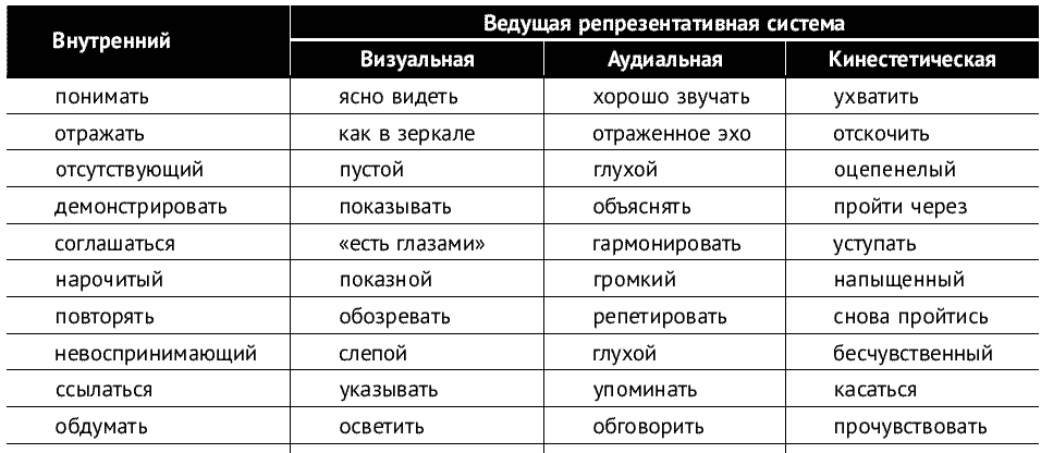 Один из надежных способов определить ведущую репрезентативную систему человека – внимательно слушать его речь и выявлять в ней наиболее часто используемые слова, указывающие на приверженность говорящего той или иной ведущей системе (эти слова называются предикатами).