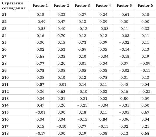Как можно видеть из таблицы 1, во-первых, количество выделившихся факторов не соответствуют трем авторским стилям совладания (продуктивному, непродуктивному и социальному), во-вторых, состав стратегий в выделенных факторах неоднозначен. Характерно, что три стратегии из 18, а именно S2 Решение проблем, S3 Работа, достижения и S14 Религиозная поддержка не имеют высокой факторной нагрузки ни по одному из выделившихся факторов.