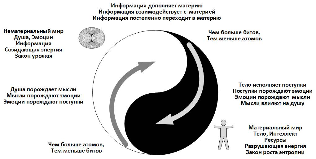 В основе мира лежат две единые, но противоположные энергии – созидания и разрушения, энергии изменения и сохранения.. Эти две энергии не существуют одна без другой, дополняют друг друга до единого целого, взаимодействуют друг с другом, плавно переходят одна в другую, периодически меняются местами, передавая друг другу управление, и периодически порождают друг друга, создавая более сложные структуры. Все эти свойства важно понимать и использовать! Однако, хочу сразу же уйти от эзотерики и привести более современную трактовку символа