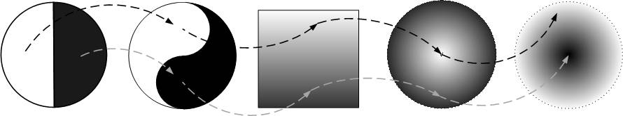 На мой взгляд, не стоит привязываться к точной форме рисунка Инь-Ян, символизирующего взаимодействие двух энергий – энергии сознания и энергии тела. Гораздо важнее суть и метафора, которую этот символ в себе несет, а форма представления метафоры может быть разной (рис.).