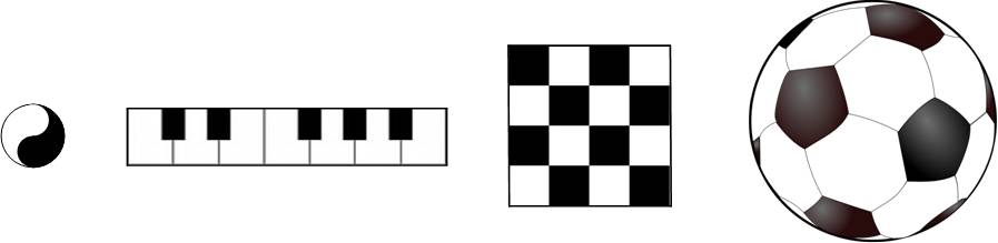 Однако, несмотря на то, что символ Инь-Ян выглядит плоским, по сути он точечный и отражает две полярности, присутствующие в каждой отдельно взятой точке. Иными словами, любая черная точка, со временем обязательно инвертируется в белую. Если переходить от точки к линии, поверхности и пространству, этот же символ можно было бы отобразить в виде метафор, которые находятся у всех на виду: клавиши рояля, шахматная доска и футбольный мяч.