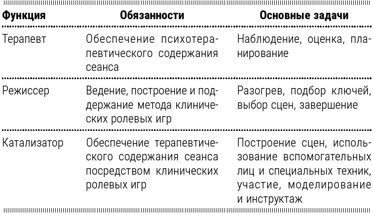 Д. Киппер[62] (1993) отобразил составляющие роли драматерапевта в следующей таблице.