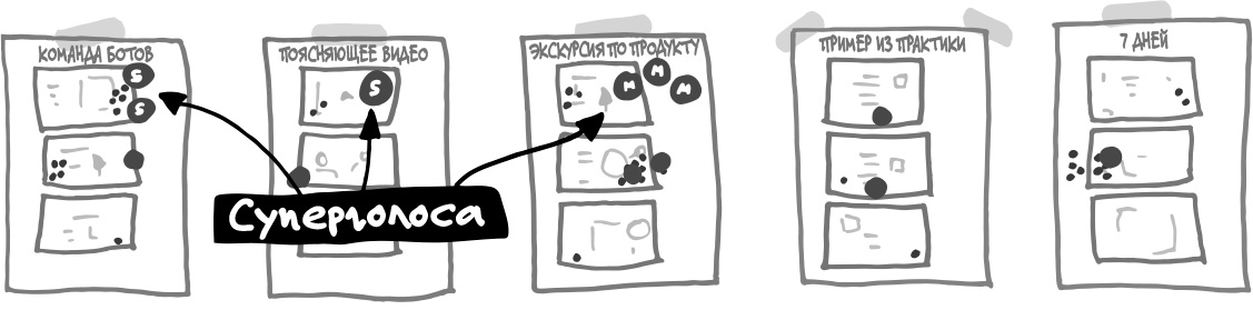 Хотя наброски, не получившие суперголосов, и не попали в число победителей, однако они ни в коем случае не являются проигравшими. Они попадают в категорию отложенных на потом. Вы можете использовать некоторые элементы этих решений при создании прототипа или вернуться к ним позже, во время последующих «спринтов».