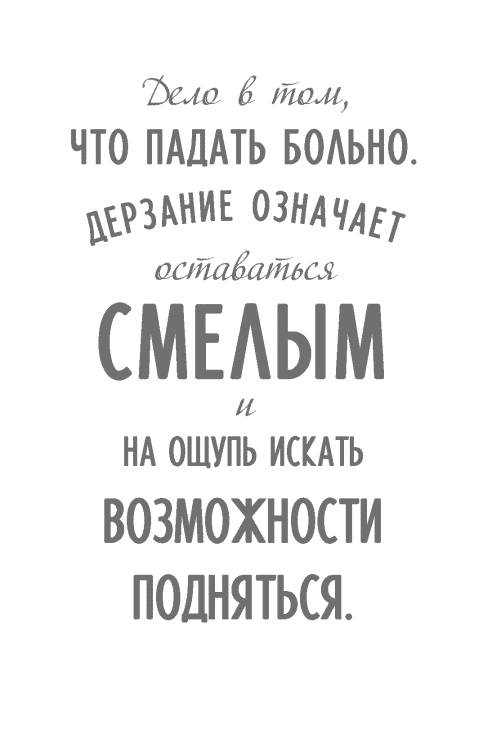 Воцарилась долгая пауза перед тем, как он заметил: «И после этого вы по-прежнему говорите, что дерзание того стоит?» Я ответила утвердительно, добавив: «Сегодня я говорю «да», потому что не лежу ничком после тяжкого падения. Но даже в разгар борьбы я бы сказала, что делать эту работу не просто стоит: она является ключом к искренней жизни, хотя ручаюсь, что, если бы вы задали мне этот вопрос, когда я падала, я бы не была так полна энтузиазма и испытывала бы гораздо больше неприятных эмоций. У меня не очень-то хорошо получается падать и нащупывать дорогу назад».