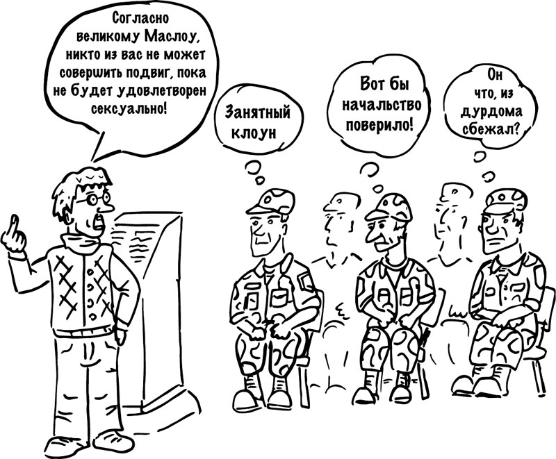 Психологи не смогли его описать, хотя он очевиден, так как вряд ли найдется много психологов, поглощенных чувством долга. Наивысшая движущая сила для таких людей – личные достижения, что наглядно демонстрирует пирамида Маслоу. А наиболее часто встречающийся уровень мотивации психиатров (в соответствии с реальными опросами студентов-психиатров) – деньги.