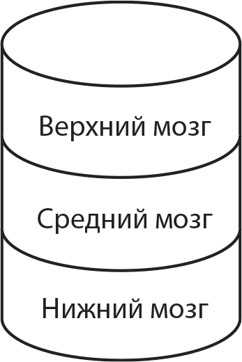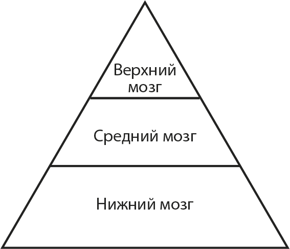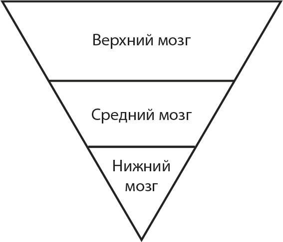 Три мозга иррационального человека выглядят вот так, контроль над ситуацией держит мозг рептилии. Это заставляет человека реагировать по типу «бей или беги», а также обуславливает узость взгляда на мир.