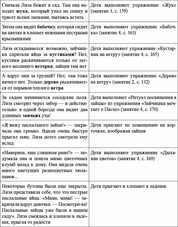 Примечания. В ходе выполнения упражнения происходит обобщение и закрепление навыков, полученных на этом и предыдущих занятиях (упражнения «Жук», «Бабочка», «Кустарник на ветру», «Дерево на ветру», «Ритуал посвящения в зайцы» (из упражнения «Зайчишка мечтает о Пасхе») и «Дыхание цветов»).