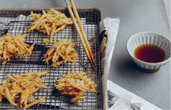 Осторожно поместите 1/3 стакана покрытых кляром овощей в горячее масло и, поджарив, сделайте из них маленький пирожок какиагэ. Когда пирожки станут золотисто-коричневыми и всплывут, вытащите их и положите на поднос с бумажным салфетками, чтобы удалить остатки масла.