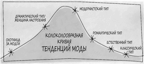 Различные стиль-персоны занимают различные места на графике. Кривая тенденции моды весьма показательна в эмоциональном плане, и не только на уровне отдельных индивидуумов. Колоколообразная кривая тенденций моды также позволяет изучить человеческое поведение и способность к адаптации.
