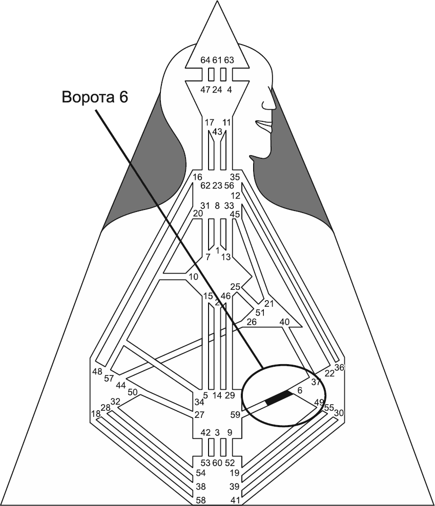 Ворота 6 соединяют Сакрал с Эмоциями (рис. 56). Они испускают проникающую энергию, которая способна внедряться в ауры других людей. Эти Ворота полны эмоций и энергии, лишенной сексуального подтекста.