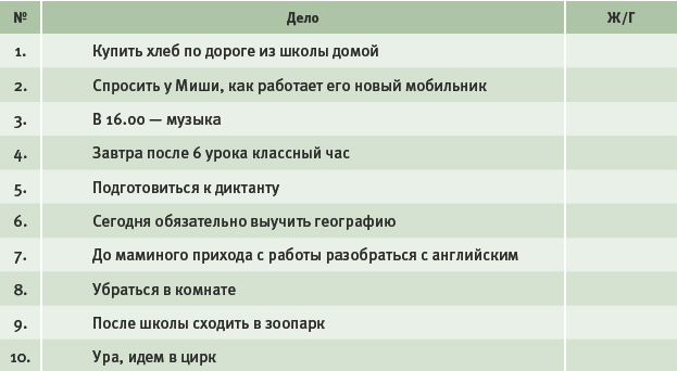 Если ребенок постарше, можно не играть в эту игру, а просто выполнить упражнение: читать дела, представленные в таблице, и закрашивать клеточку напротив жесткого дела синим цветом, а напротив гибкого – зеленым.