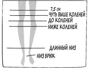 Оптимальная длина должна приходится на верх обуви в области подъема или чуть-чуть ниже верха, а сзади брюки должны закрывать половину задника обуви. Иногда встречаются слегка удлиненные брюки, закрывающие каблук. Невысоким женщинам особенно нравится такой покрой с высокими каблуками, поскольку это значительно увеличивает рост. Это личный выбор каждой женщины. Мы бы не рекомендовали его всем женщинам без исключения, потому что низ брюк, достающих до земли, быстро пачкается и затаптывается каблуками.