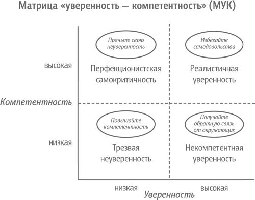 Итак, цель определена – стать компетентным. Но как ее достигнуть? В пику популярному мнению – через низкую, а не высокую уверенность. На деле высокая уверенность тормозит самосовершенствование, так как, в отличие от низкой уверенности, не стимулирует процесс самопознания. Как правило, низкая уверенность – симптом низкой компетентности, подсказывающий, что нам необходимо совершенствоваться. Поэтому так важно признавать и ценить свою неуверенность, ведь это ключевой стимул к самопознанию, который, в свою очередь, является ключевым стимулом к самосовершенствованию. Не познав себя, особенно свои слабые места, вы никогда не сможете стать лучше. Ведь какова альтернатива? Самоуверенный и некомпетентный человек. Как вы, вероятно, уже поняли, у такого типа личности мало преимуществ и много недостатков. Два других типа, компетентность в сочетании с высокой уверенностью и компетентность в сочетании с низкой уверенностью, встречаются гораздо реже, чем низкая уверенность в сочетании с низкой компетентностью и особенно высокая уверенность в сочетании с низкой компетентностью. Чтобы наглядно представить возможные связи между уверенностью и компетентностью, рассмотрим следующий рисунок, который можно назвать «Матрицей “уверенность – компетентность”» (МУК).