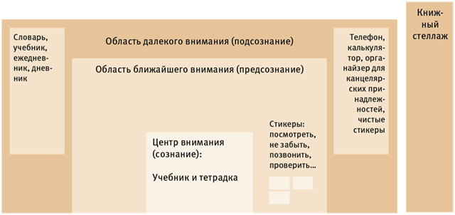 Организация рабочего стола ребенка должна быть комфортна структуре внимания, то есть содержать области, соответствующие зонам сознания, предсознания и подсознания. В области сознания должен находиться всего один объект, на котором ребенок концентрируется в данный момент. Область предсознания должна содержать 5–9 объектов (лучше не более 7), про которые ребенок не должен забыть, а область подсознания может содержать все, что ребенку нужно для работы.