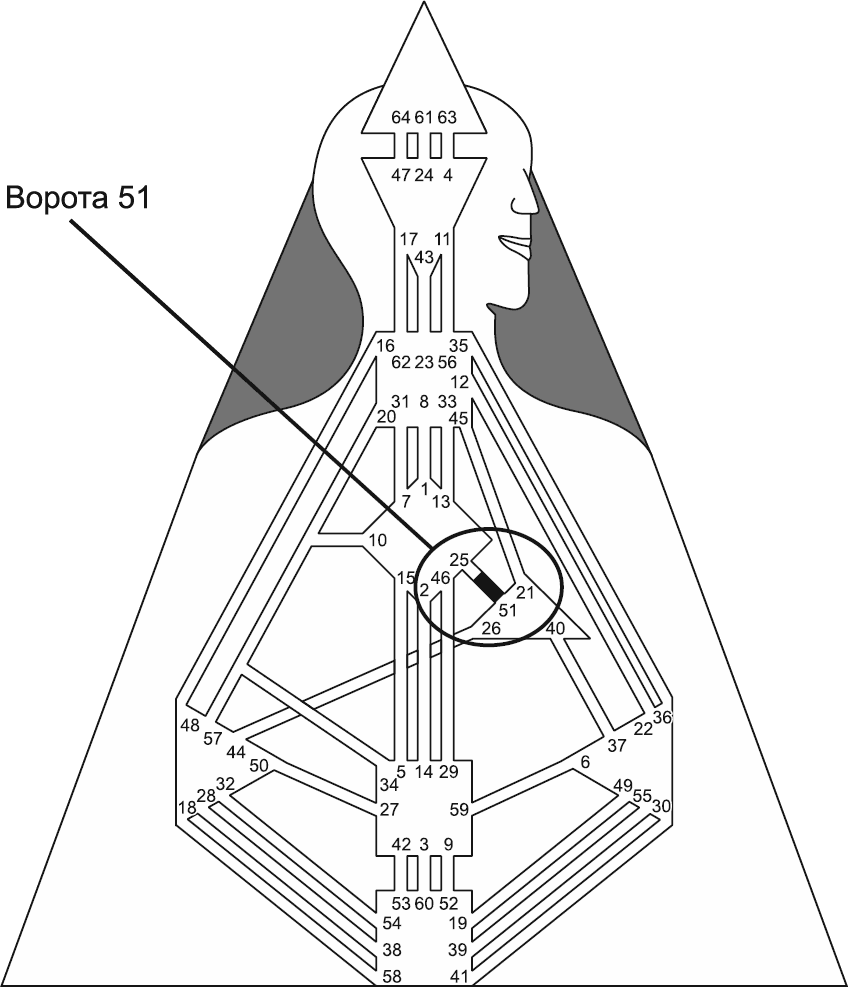 Ворота 51 (рис. 101) – одни из самых интересных в системе Дизайна Человека. Их энергия побуждает человека выделиться на общем фоне, используя эпатаж. Многие обладатели Ворот 51 шокируют окружающих просто смеха ради, но и сами они особо восприимчивы к этой энергии. Как правило, жизнь таких людей наполнена яркими впечатлениями, значительно влияющими на их мировоззрение. Ра Уру Ху обладал Воротами 51, и самым потрясающим событием в его жизни стало знакомство с системой Дизайна Человека. Люди, в Картах жизни которых проявлена шокирующая энергия, часто начинают свой путь к постижению Великого Духа с судьбоносных событий, переворачивающих их прежние взгляды. Многие из таких людей пережили клиническую смерть или другие удивительные события.