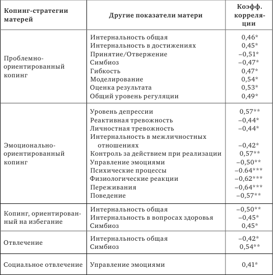 Связи эмоционально-ориентированного копинга в группах будущих матерей и будущих отцов также представлены по-разному. В группе женщин эта стратегия совладания соотносится с блоком показателей эмоциональной регуляции – Уровнем депрессии и Реактивной и Личностной тревожностью, всеми четырьмя блоками показателей психических состояний – Психическими процессами, Физиологическими реакциями, Переживаниями и Поведением, показателем эмоционального интеллекта – Управление эмоциями, показателем волевого контроля – Контроль за действиями при реализации и показателем субъективного контроля – Интернальность в межличностных отношениях. В группе будущих отцов связи этой стратегии совладания представлены всего двумя корреляциями – с показателями Уровень депрессии и Поведение.