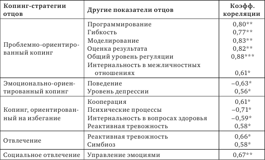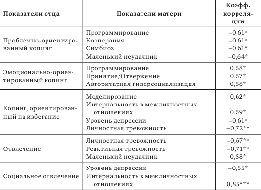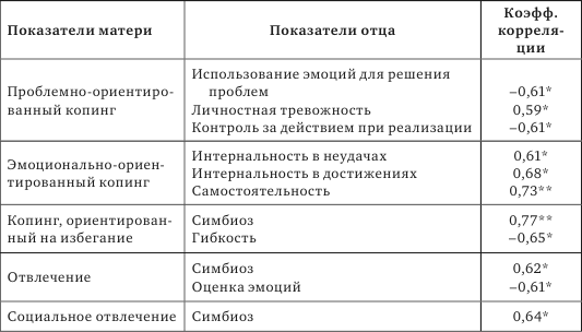 Корреляционный анализ между стратегиями совладания, избираемыми будущими родителями, показал, что ориентация на избегание проблем будущих матерей связана с ориентацией на избегание проблем и стратегией отвлечения будущих отцов (r = 0,62, p ? 0,05, r = 0,76, p ? 0,01). Таким образом, стратегия избегания в нашем случае является не только индивидуальным, но и семейным копингом.