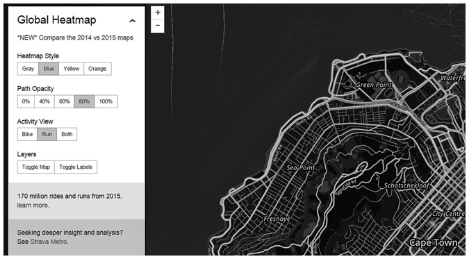 Кстати, сервис показывает и наиболее любимые у велосипедистов маршруты – это может помочь, если вы берете двухколесный транспорт напрокат. HeatMap одинаково хорошо работает что в Кейптауне, что в Будапеште, что в любом другом городе – проверено.