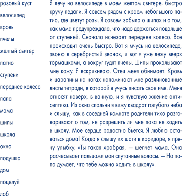 Вот как я работала с одним воспоминанием, используя заметки на полях. Сначала я определилась с темой: как я однажды упала в розовый куст перед детским садом. Потом я выписала слова на поле, все слова, которые у меня ассоциировались с тем утром. Затем, когда я начала писать о моем падении, у меня уже был список слов, который мне помог.
