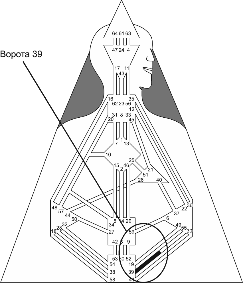 Ворота 39 (рис. 89) содержат очень эмоциональную и насыщенную энергию, которая делает ее обладателей музыкальными, творческими и влюбчивыми. Но эта энергия сложна и провокационна, причем провокации могут как повеселить шутливым подначиванием, так и серьезно ранить, вызвав в душе бурю негатива и страха. Так что с Воротами 39 следует быть настороже как обладателям этой энергии, так и их близким.