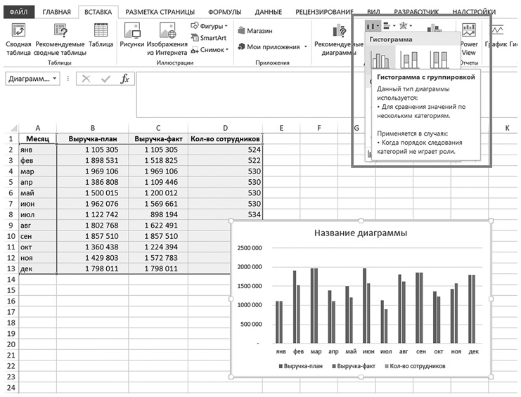 У нас есть несовместимые по объему данные – количество сотрудников в компании и выручка (план-факт). Но мы хотим сравнить их в динамике на одном графике. Строим обычный график по всем данным: