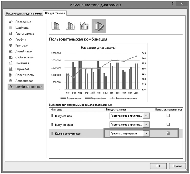 Меняем тип на «График» и указываем, что количество сотрудников отображается на вспомогательной оси: